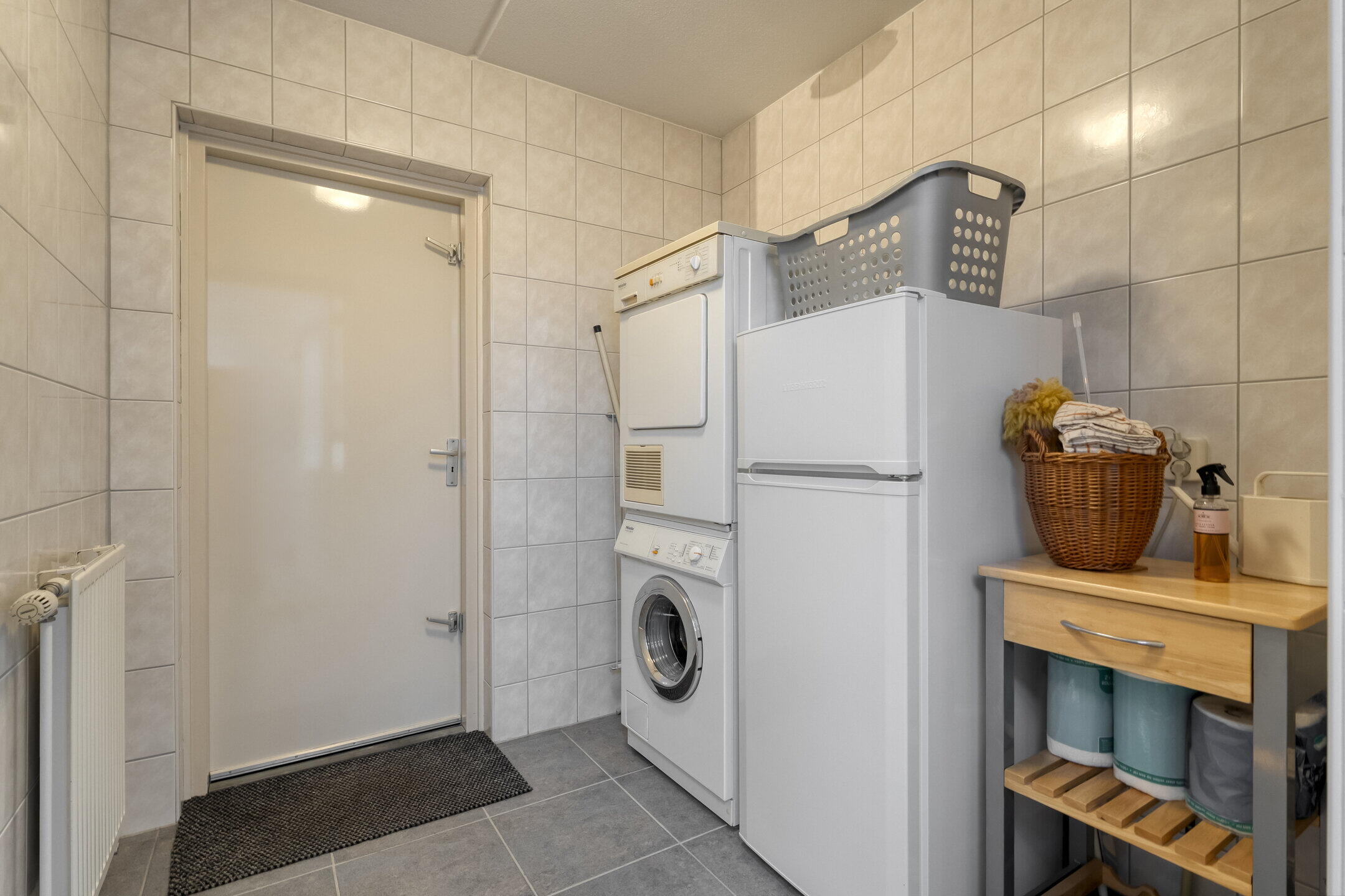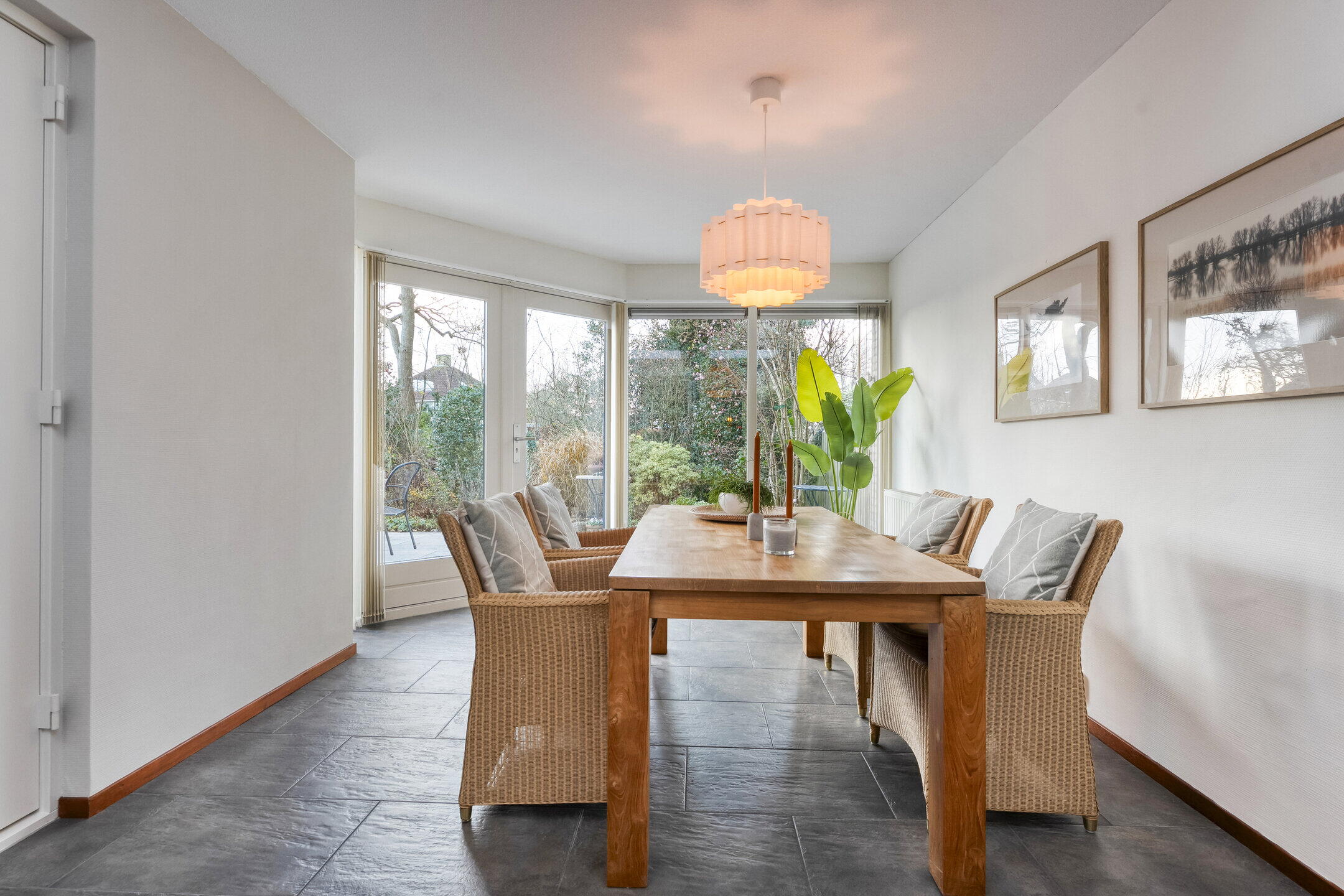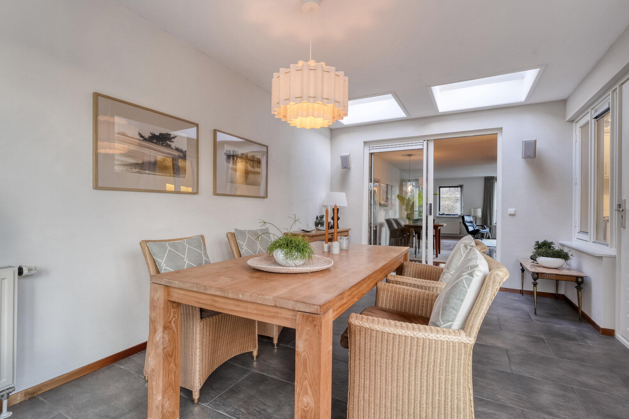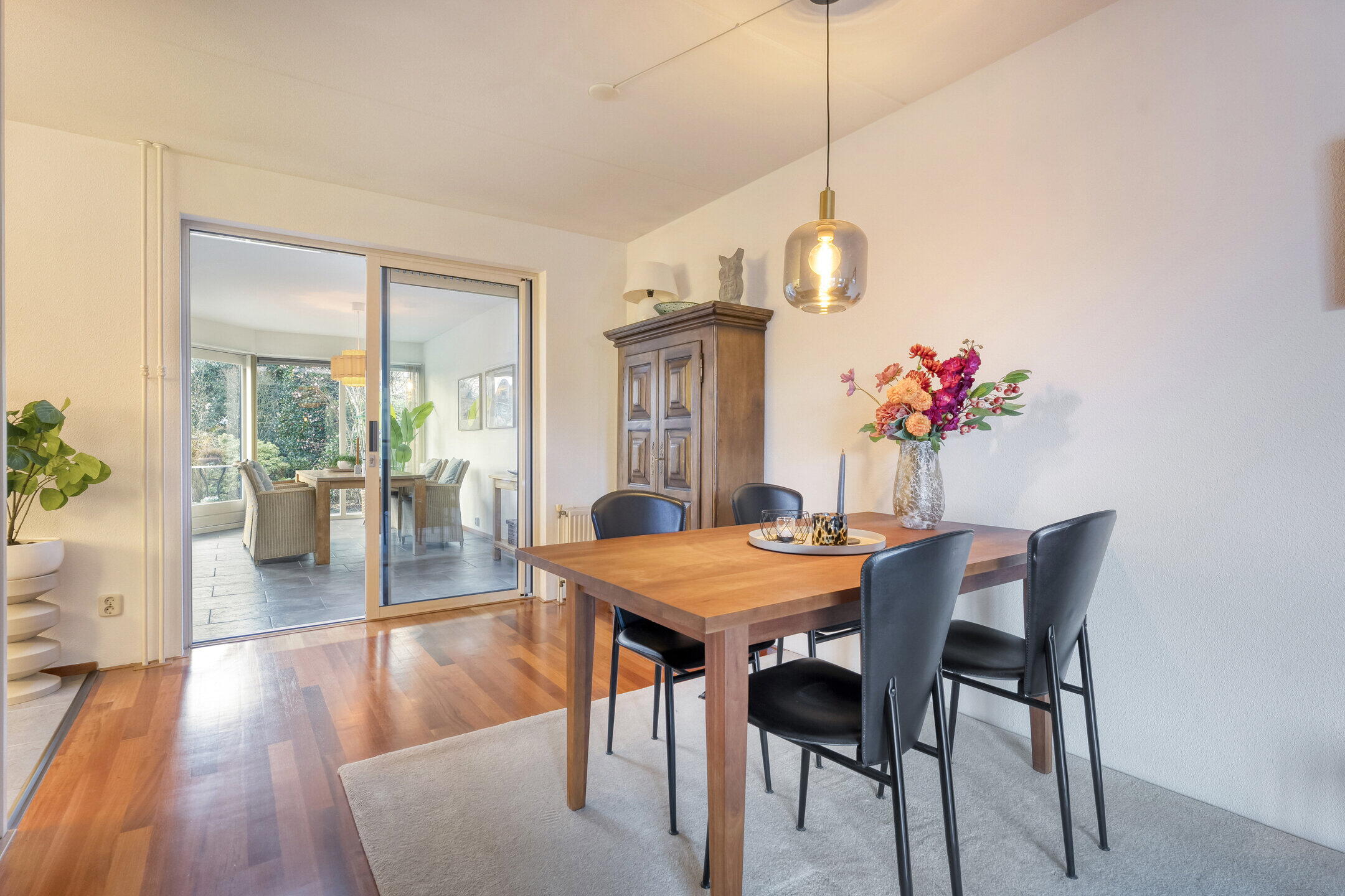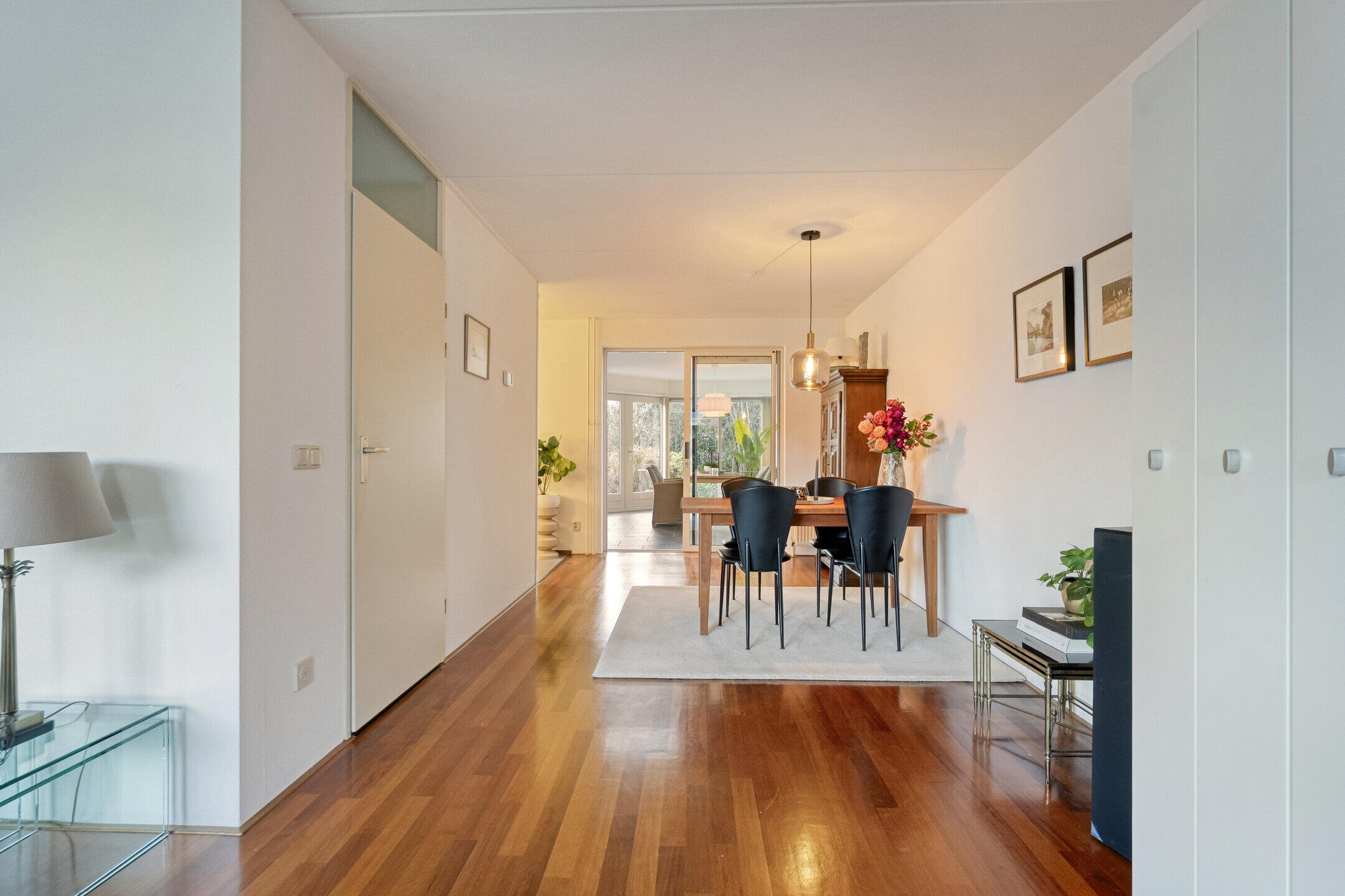 Zijentree en hal met meterkast, trapopgang en toiletruimte met wandcloset en fontein. Royale L-vormige woonkamer met fraaie parketvloer en veel lichtinval. Aan de achterzijde bevindt zich de halfopen keuken met aanrecht in hoekopstelling voorzien van diverse inbouwapparaten. Daarachter is de praktische bijkeuken met witgoedaansluitingen en doorgang naar de garage. De aangebouwde tuinkamer is voorzien van vloerverwarming en door de vele ramen is er een optimale lichtinval. De fraai aangelegde achtertuin is middels tuindeuren te bereiken.